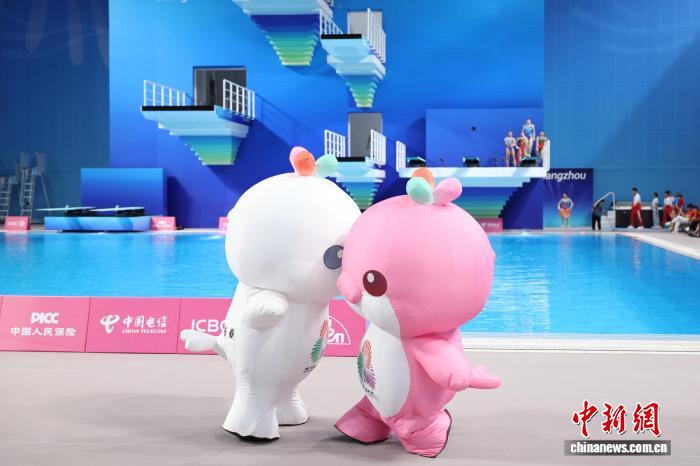 11月11日,第十五屆全國(guó)運(yùn)動(dòng)會(huì)跳水項(xiàng)目女子3米跳板決賽在廣東省奧體中心游泳跳水館舉行。圖為比賽前,十五運(yùn)會(huì)吉祥物帶來暖場(chǎng)表演。 中新社記者 陳楚紅 攝
