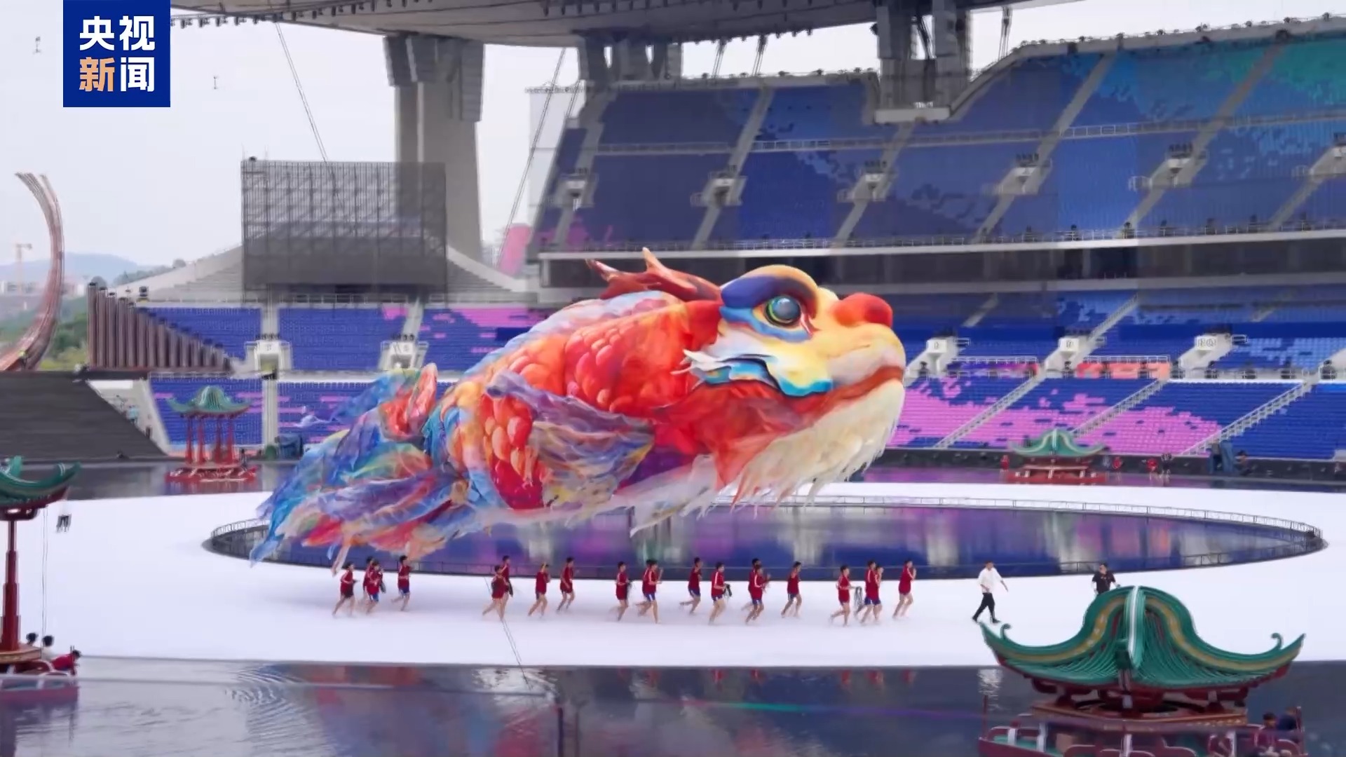 十五運(yùn)會開幕式美術(shù)總設(shè)計 巨型鰲魚原創(chuàng)設(shè)計者 尚天寶:這只鰲魚的造型和傳統(tǒng)意義上的鰲魚有些許不同,保留了龍頭魚身,但是尾巴部分我們做了特殊的處理,把這種鳳尾鯉魚的大尾巴嫁接了進(jìn)來,魚鰭、魚身參考了金龍魚的魚身,讓它更好看,色彩上更嶺南,發(fā)揮了嶺南的濃郁用色的極致。
