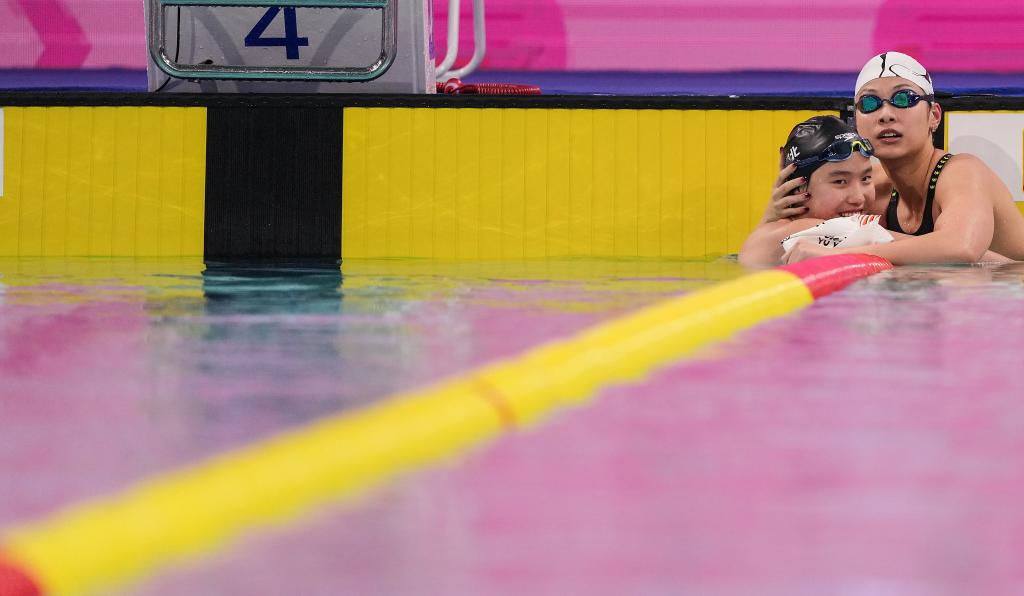 11月11日,河北隊選手于子迪(左)在女子200米個人混合泳決賽后與浙江隊選手余依婷擁抱致意。