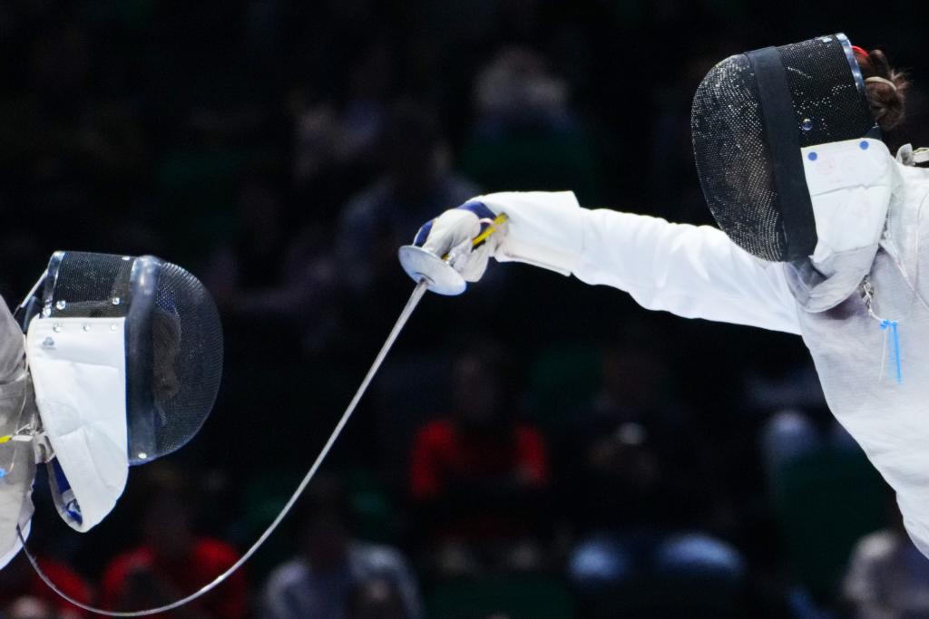 11月20日,江蘇隊選手霍興欣(左)和廣東隊選手吳培林在女子花劍團體銅牌賽中。