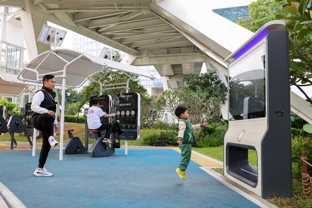 2024年12月27日,在深圳筆架山公園里,小朋友和家長一起使用智能互動屏鍛煉身體。