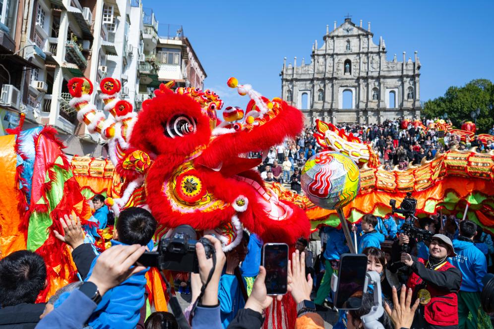 1月30日,演員在澳門大三巴牌坊前表演舞龍。