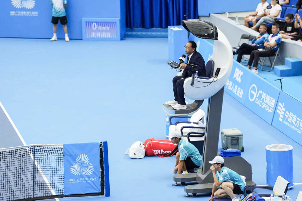 這是11月15日在廣東珠海橫琴網(wǎng)球中心拍攝的智能電動升降裁判椅。