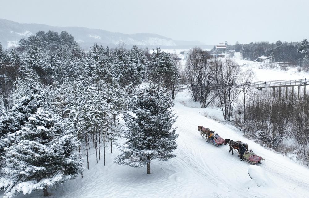 2024年11月27日,游客在黑龍江省漠河市北極村體驗馬拉爬犁項目(無人機(jī)照片)。新華社發(fā)(徐率 攝)
