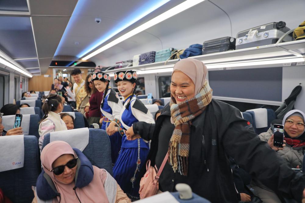11月22日,在麗香鐵路動(dòng)車組列車上,東南亞游客與身著民族服飾的乘務(wù)員一同跳舞。