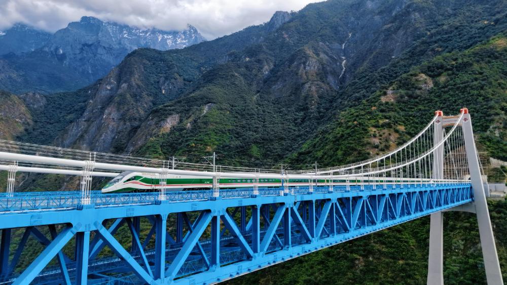 11月21日,一列動(dòng)車組列車經(jīng)過(guò)虎跳峽金沙江鐵路大橋(無(wú)人機(jī)照片)。