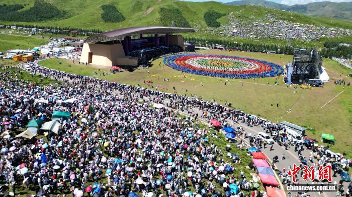 2024年8月4日,第22屆九色甘南香巴拉旅游藝術(shù)節(jié)在甘肅省甘南藏族自治州當(dāng)周草原開幕。圖為開幕式現(xiàn)場鍋莊舞表演。(資料圖)九美旦增 攝