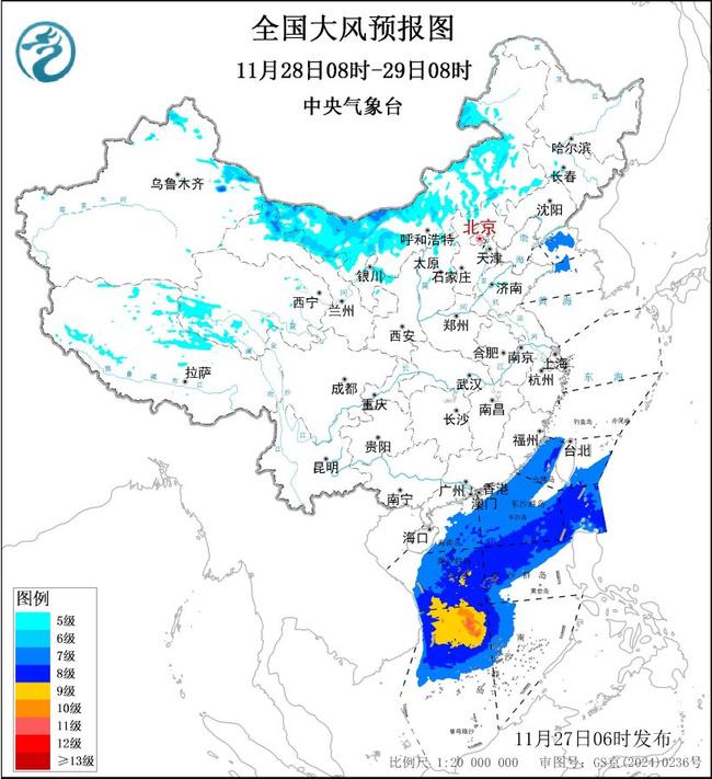預計,11月27日08時至28日08時,新疆東部、內(nèi)蒙古中西部、甘肅西部、寧夏北部、山東半島、江蘇沿海以及青海西南部、西藏中西部等地有5~7級大風,陣風8~9級,其中新疆東部山口地區(qū)、內(nèi)蒙古西部部分地區(qū)風力可達8級,陣風9~10級;11月27日08時至28日08時臺灣海峽、巴士海峽、南海北部和中東部海域?qū)⒂?級、陣風9級的東北風,其中南海中西部和西南部海域的風力可達10級、陣風11級,南海中東部海域的風力可達9級、陣風10級,南海東南部海域?qū)⒂?級、陣風9級的東南風。