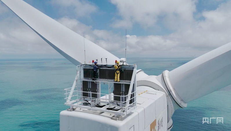 工作人員在風機頂部開展檢修工作(央廣網發(fā) 受訪者供圖)