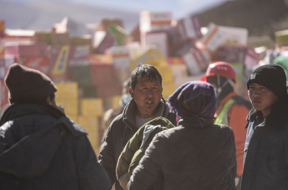2025年1月10日,定日縣長(zhǎng)所鄉(xiāng)古榮村黨支部書記次仁平措(中)協(xié)助群眾搬進(jìn)板房。