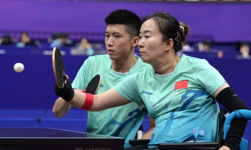 圖為2023年10月26日,毛淋(前)和隊(duì)友翟翔在杭州第4屆亞殘運(yùn)會(huì)乒乓球混合雙打4級B組的比賽中。新華社記者 李賀 攝