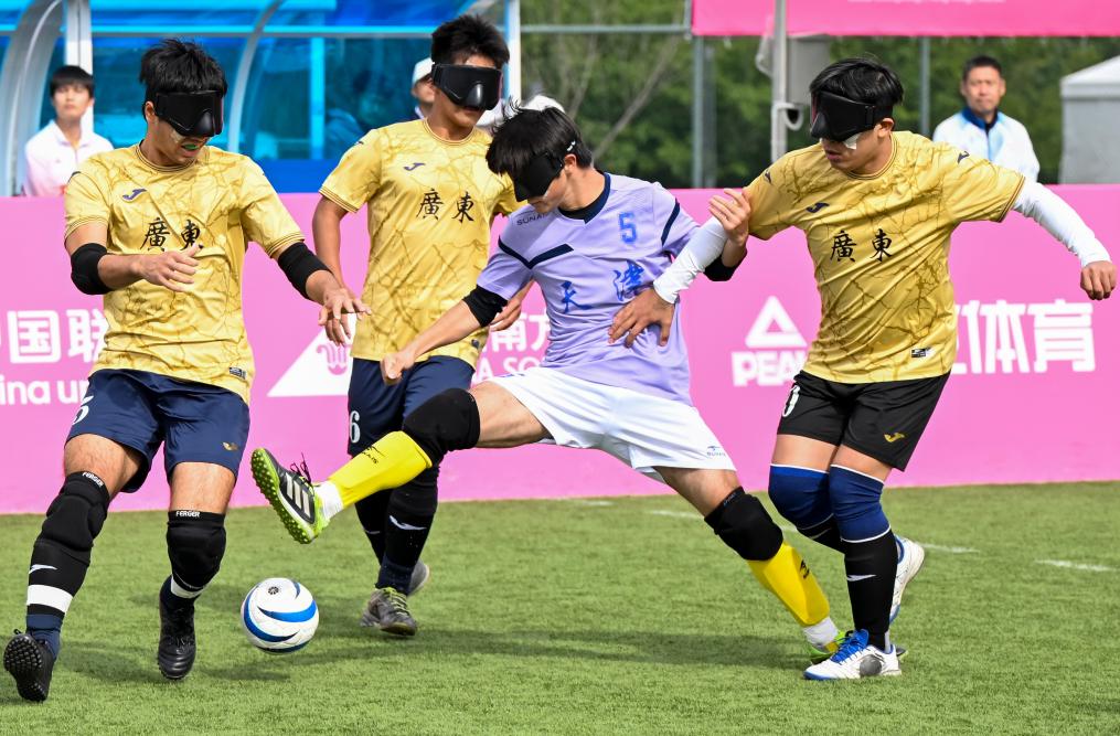 12月14日,在廣州舉行的全國第十二屆殘疾人運(yùn)動(dòng)會(huì)暨第九屆特殊奧林匹克運(yùn)動(dòng)會(huì)盲人足球項(xiàng)目男子組小組賽中,天津隊(duì)1:0戰(zhàn)勝廣東二團(tuán)隊(duì)。圖為天津隊(duì)球員范海林(右二)在比賽中突破。新華社記者 陳浩明 攝