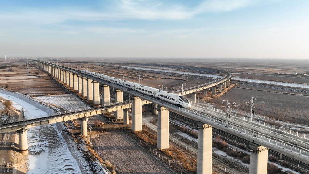12月14日,一列試驗(yàn)列車行駛在包銀高鐵線路上(無人機(jī)照片)。新華社發(fā)