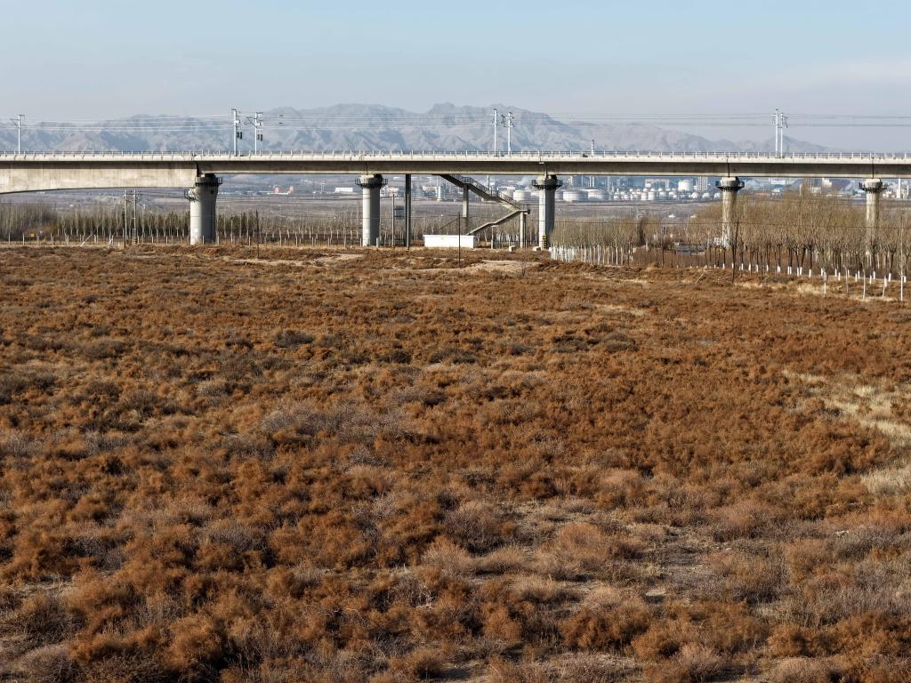 這是12月11日拍攝的包銀高鐵二道坎跨京藏高速特大橋,橋下是內(nèi)蒙古西鄂爾多斯國(guó)家級(jí)自然保護(hù)區(qū)烏海片區(qū)(無人機(jī)照片)。新華社記者 李志鵬 攝