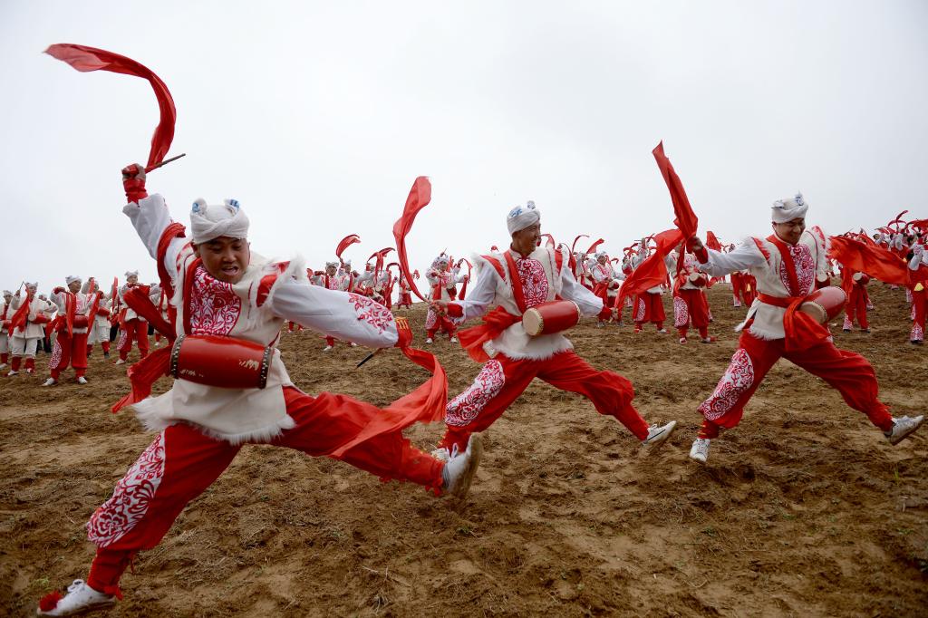 腰鼓手在陜西省延安市安塞區(qū)南溝村進行一場山地腰鼓演出。新華社記者 劉瀟 攝