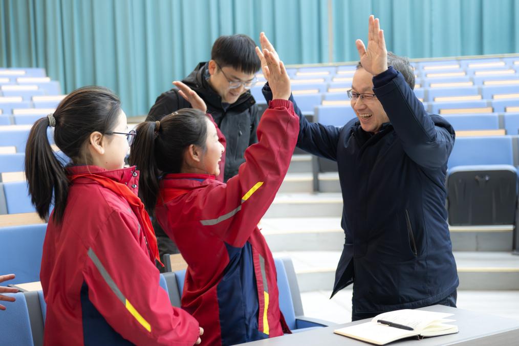 在紅安縣將軍城小學,記者與參加思政示范課的小學生擊掌互動。新華社記者 肖藝九 攝