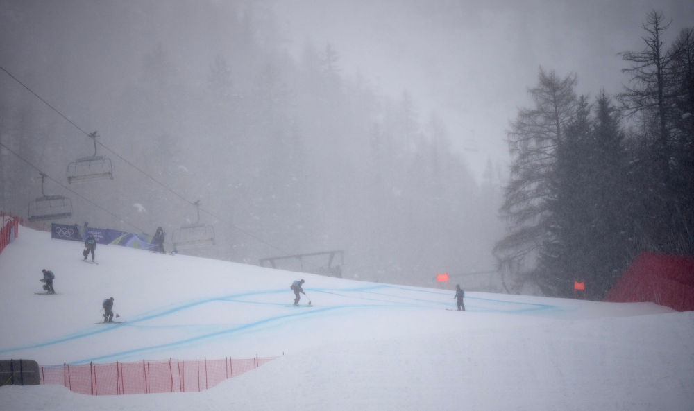 2月7日,高山滑雪女子滑降第三次官方訓練受天氣影響中斷。圖為工作人員在賽道上。新華社記者 費茂華 攝