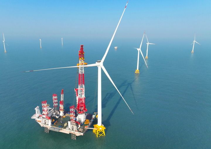 2026年1月13日在福建閩南海域拍攝的“大橋海風(fēng)”號(hào)2000噸自升式海上風(fēng)電安裝平臺(tái)和20兆瓦風(fēng)電機(jī)組吊裝現(xiàn)場(無人機(jī)照片)。