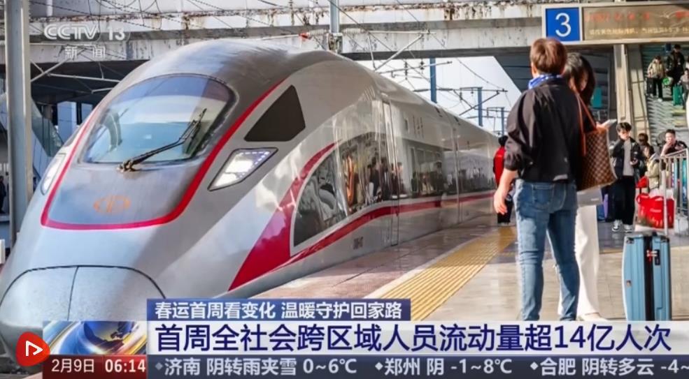 2026年春運(yùn)2月2日拉開帷幕,到2月9日是第八天。據(jù)此前綜合研判的數(shù)據(jù),在今年春運(yùn)40天的時間里,全社會跨區(qū)域人員流動量將會達(dá)到95億人次,預(yù)計創(chuàng)歷史新高。數(shù)據(jù)顯示,春運(yùn)首周,預(yù)計全社會跨區(qū)域人員流動量累計超14億人次,日均超2億人次,比去年同期增長2%。交通運(yùn)輸部預(yù)計,2月14日前后將達(dá)到春節(jié)前客流峰值。