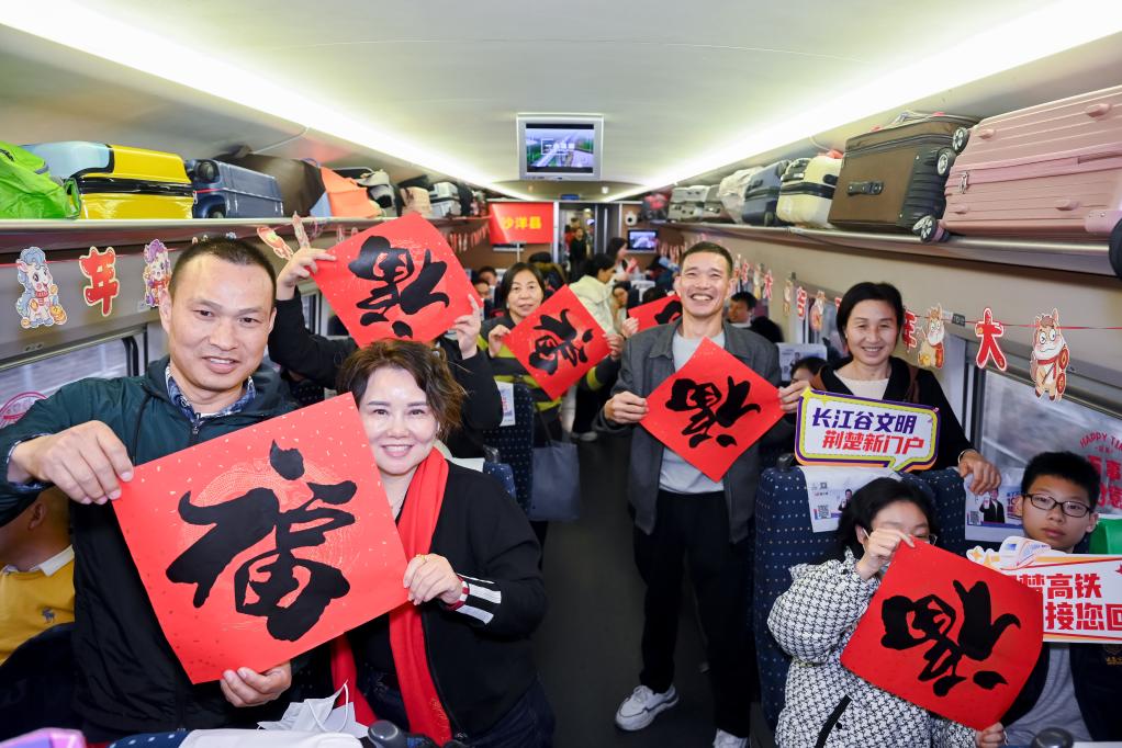 喜慶春聯(lián)、福字窗花、吉祥燈籠……2月7日,布置一新的G1136次列車,載著800多名在外務(wù)工的湖北荊門人從廣州啟程,一路歡聲笑語中,奔赴他們闊別已久的家鄉(xiāng)。