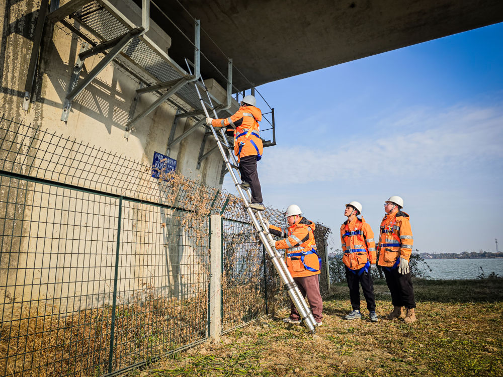 橋體間的縫隙狹窄,進(jìn)入大橋內(nèi)部后更是伸手不見五指。上海高鐵基礎(chǔ)設(shè)施段湖州車間橋梁組工作人員借著頭燈的光線,像啄木鳥為樹木問診一般,沿梁體一路進(jìn)行聽診式的檢查。