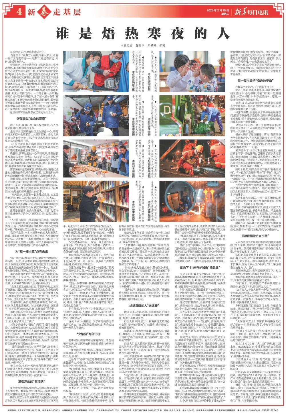 春節(jié)前夕,記者走進(jìn)他們中間:醫(yī)務(wù)社工將精油搓熱,俯身輕揉臨終重病患者的手臂,在安寧療護(hù)中心守護(hù)生命的最后一程;兒童福利院的“黃媽媽”每半個小時查一次夜,把孩子們的被角掖了又掖;小巷餐館燈火闌珊處,餐廚清運(yùn)工得工作到凌晨3點(diǎn)才能換得一街潔凈;冬夜里消防員必須把外套放在枕邊,以備警鈴驟響,用最短時間沖向兇險(xiǎn);熱力管網(wǎng)運(yùn)行工爬進(jìn)地下11米深的熱力井,屏氣凝神傾聽每一絲細(xì)微聲響;驛站里總有暖光亮著,外賣小哥推門而入,一口熱水祛一身風(fēng)霜;胡同口的書店舍不得打烊,為了留一屋書香給“有趣的靈魂”;1路公交的乘務(wù)員也是講解員,載著想看升旗的乘客奔赴長安街的黎明……他們可能是寒夜中容易被忽略的小人物,但恰恰是這樣的人以一身熱汗抵一路風(fēng)寒,焐熱城市的每一個角落。