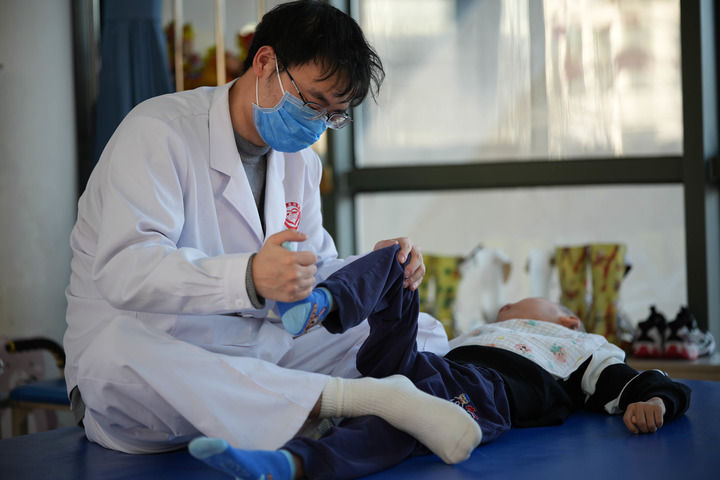 2月5日,一位福利院的老師正在給孩子進(jìn)行肢體康復(fù)訓(xùn)練。新華每日電訊記者謝晗 攝