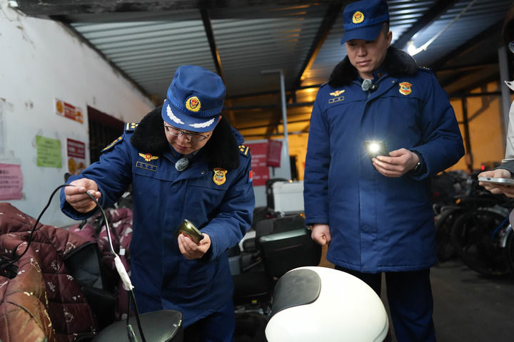 2月3日,消防站副站長王會軍(左)和消防員賈超(右)在雙榆樹南里小區(qū)的電動車停車棚檢查充電安全。新華每日電訊記者謝晗 攝