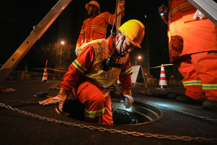 白天人多車密,深夜才是管網(wǎng)維護(hù)的“主戰(zhàn)場”。下井前,班組在井口拉好警示帶,擺好反光錐。井蓋掀開,熱氣與冷空氣凝成薄霧。按照安全作業(yè)的鐵律——“先通風(fēng)、再檢測、后作業(yè)”,班組先是對小室進(jìn)行30分鐘通風(fēng)置換,隨后將檢測儀探入井下:“氧氣含量20.9%,一氧化碳、硫化氫和易燃易爆氣體含量均為零——合格!”