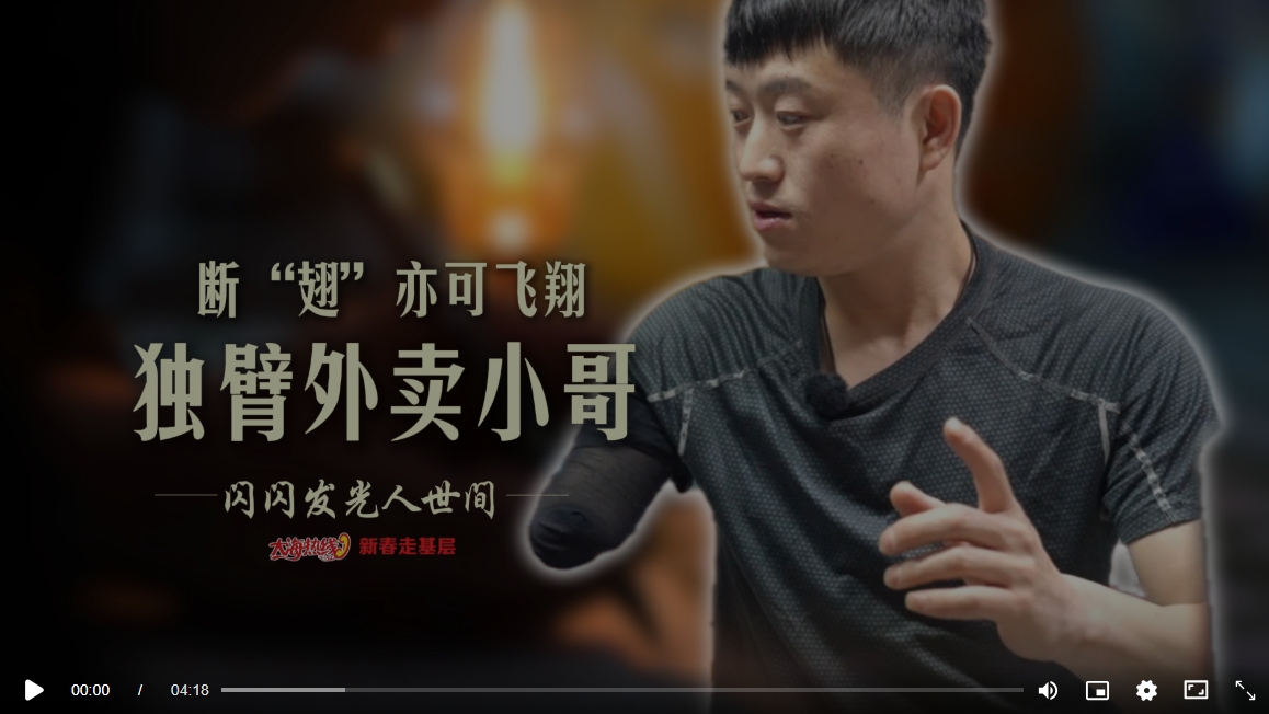 18歲意外失去右臂,不向命運(yùn)低頭,單手騎車、送餐、爬樓,憑著樂觀和韌勁,風(fēng)雨無阻跑遍阜新街巷。每天工作12小時、日均配送60單、爬樓100多層、騎行100多公里……
