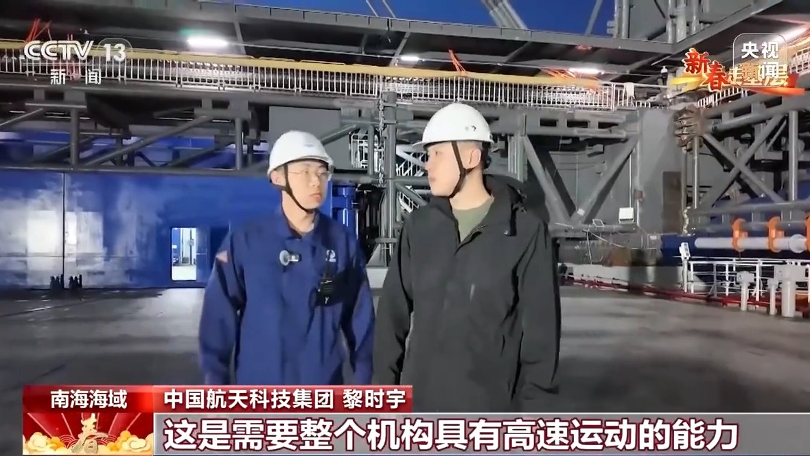 總臺(tái)記者 馬宇辰:“領(lǐng)航者”號海上回收平臺(tái)長144米,寬50米,滿載排水量超過2.5萬噸,是個(gè)名副其實(shí)的大家伙。但是發(fā)射塔架的高度接近70米,加上船體和天線,整體的高度接近30層樓高,所以它的重心是非常高的,再加上冬天的海況比較惡劣,我的感覺就是整個(gè)船體都在不規(guī)律地?fù)u晃著。