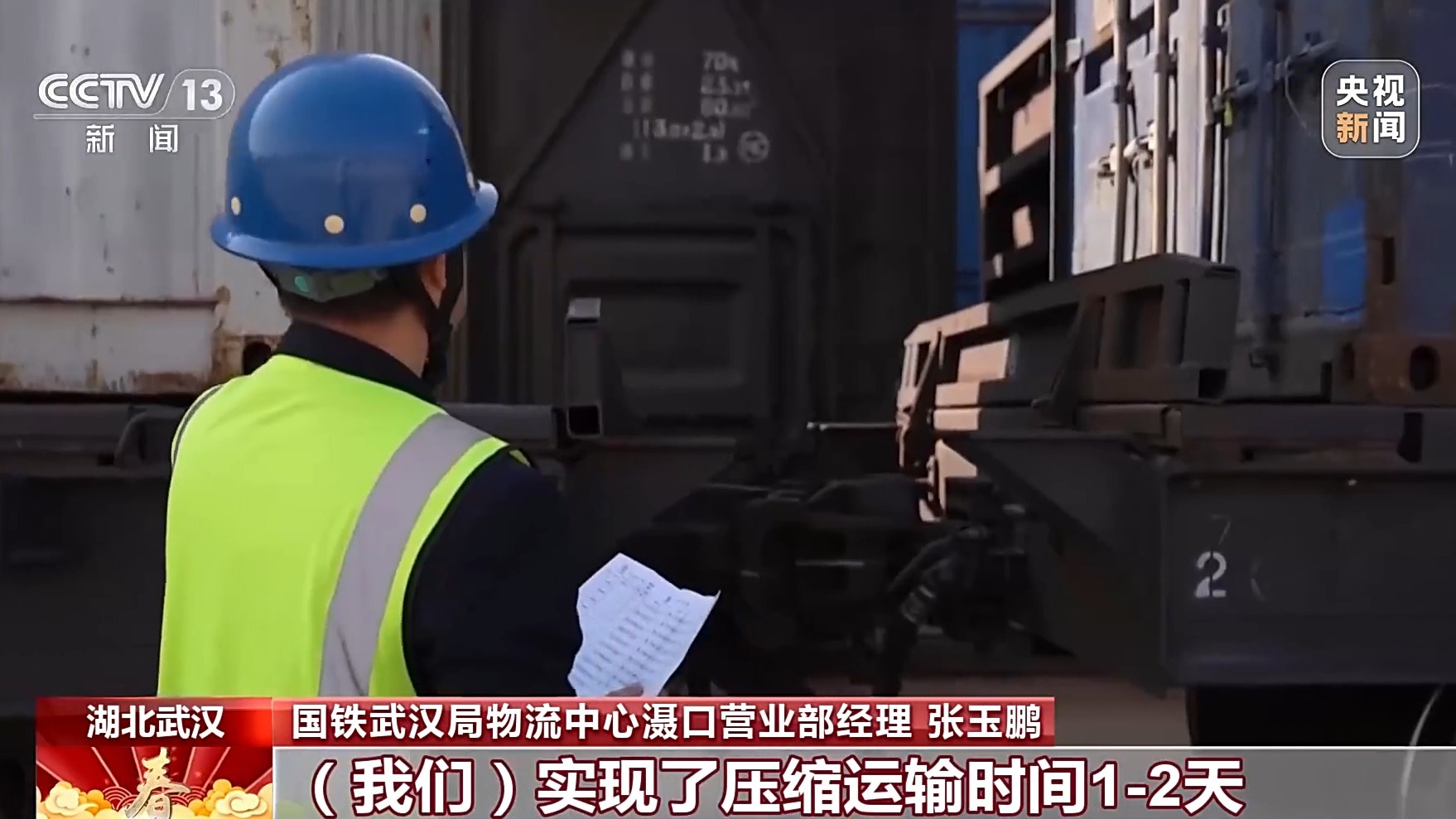 國(guó)鐵武漢局物流中心灄口營(yíng)業(yè)部經(jīng)理 張玉鵬:現(xiàn)在貨量明顯上來了,很多企業(yè)開年第一批貨都集中在這幾天發(fā)運(yùn),每天發(fā)到3列左右。通過前置查驗(yàn)、集拼集運(yùn)、雙始發(fā)站聯(lián)動(dòng),我們實(shí)現(xiàn)了壓縮運(yùn)輸時(shí)間1-2天、降低物流成本15%。