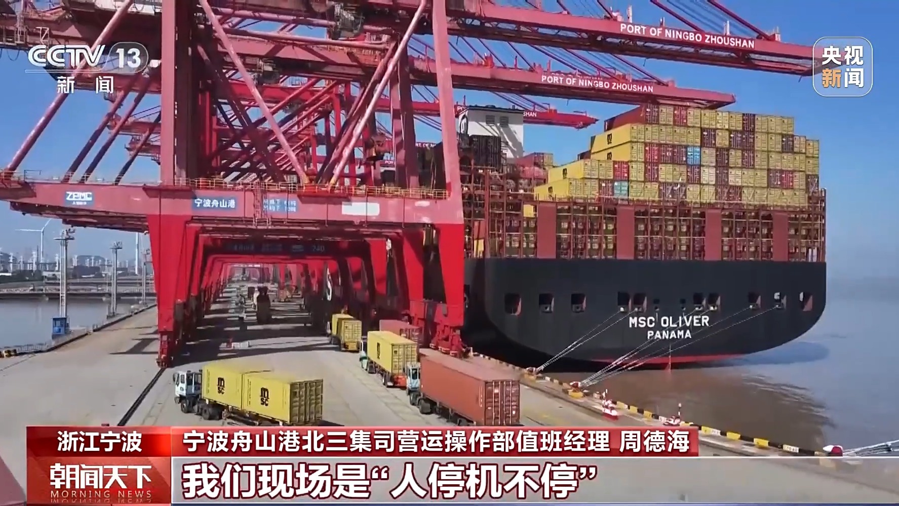 寧波舟山港北三集司營(yíng)運(yùn)操作部值班經(jīng)理 周德海:這條船載重量超過了19萬(wàn)噸,這回在我們港區(qū)的作業(yè)量超過了兩萬(wàn)標(biāo)準(zhǔn)箱,像這樣的船型,整個(gè)春節(jié)期間還是比較多的。這幾天出口箱量增長(zhǎng)比較明顯,我們現(xiàn)場(chǎng)是“人停機(jī)不?!?。節(jié)后的第一波出口集中,客戶都希望搶時(shí)間、趕船期,我們也爭(zhēng)分奪秒確保貨物能及時(shí)出運(yùn)。