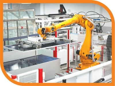 江蘇省淮安市洪澤區(qū)新源太陽能科技有限公司,工業(yè)機(jī)器人在生產(chǎn)太陽能光伏組件。