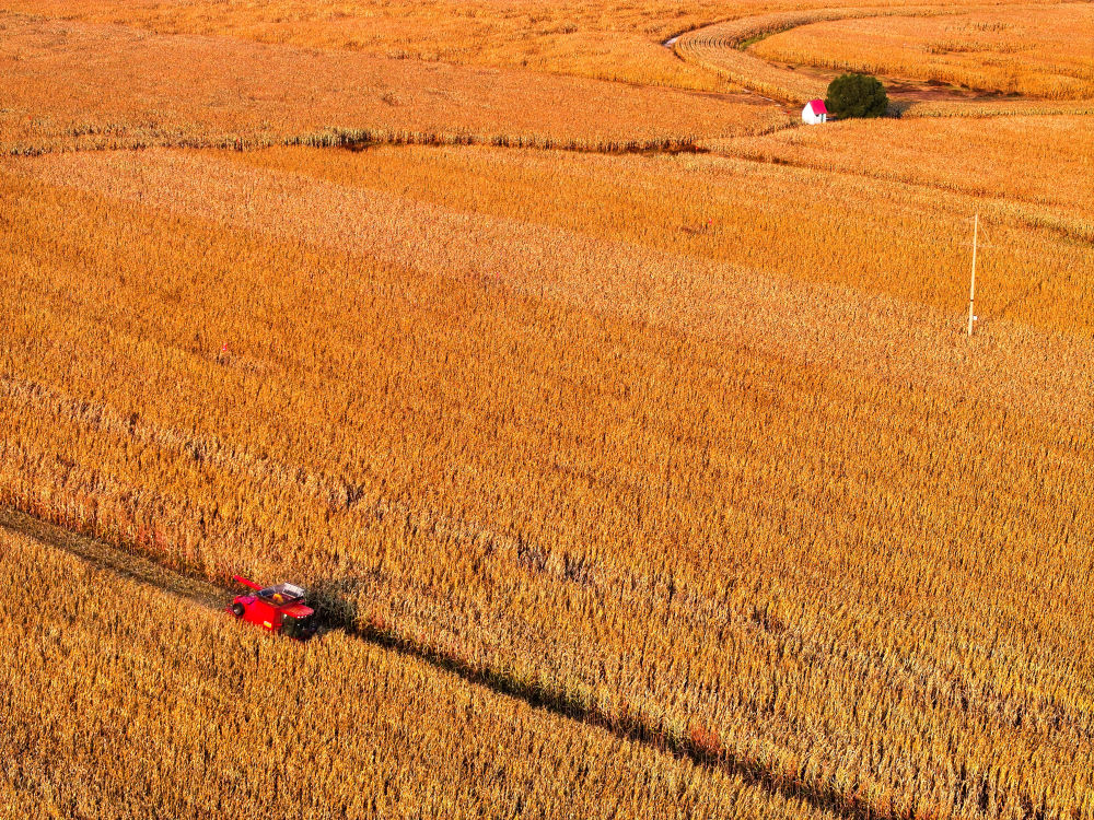 農(nóng)機(jī)手駕駛收割機(jī)在內(nèi)蒙古自治區(qū)通遼市科爾沁區(qū)豐田鎮(zhèn)收割玉米(2025年10月14日攝,無(wú)人機(jī)照片)?!笆奈濉睍r(shí)期,糧食總產(chǎn)量由2021年的1.37萬(wàn)億斤增至2025年的1.43萬(wàn)億斤,連續(xù)兩年站穩(wěn)在1.4萬(wàn)億斤的臺(tái)階。