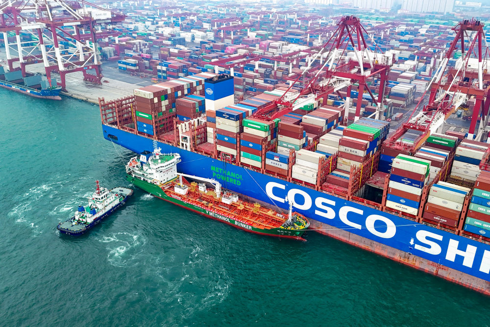 3月2日,在山東港口青島港,甲醇加注船“建航利達(dá)”輪為一艘貨輪進(jìn)行綠色甲醇“船對船”加注作業(yè)(無人機(jī)照片)。新華社發(fā)(張進(jìn)剛攝)