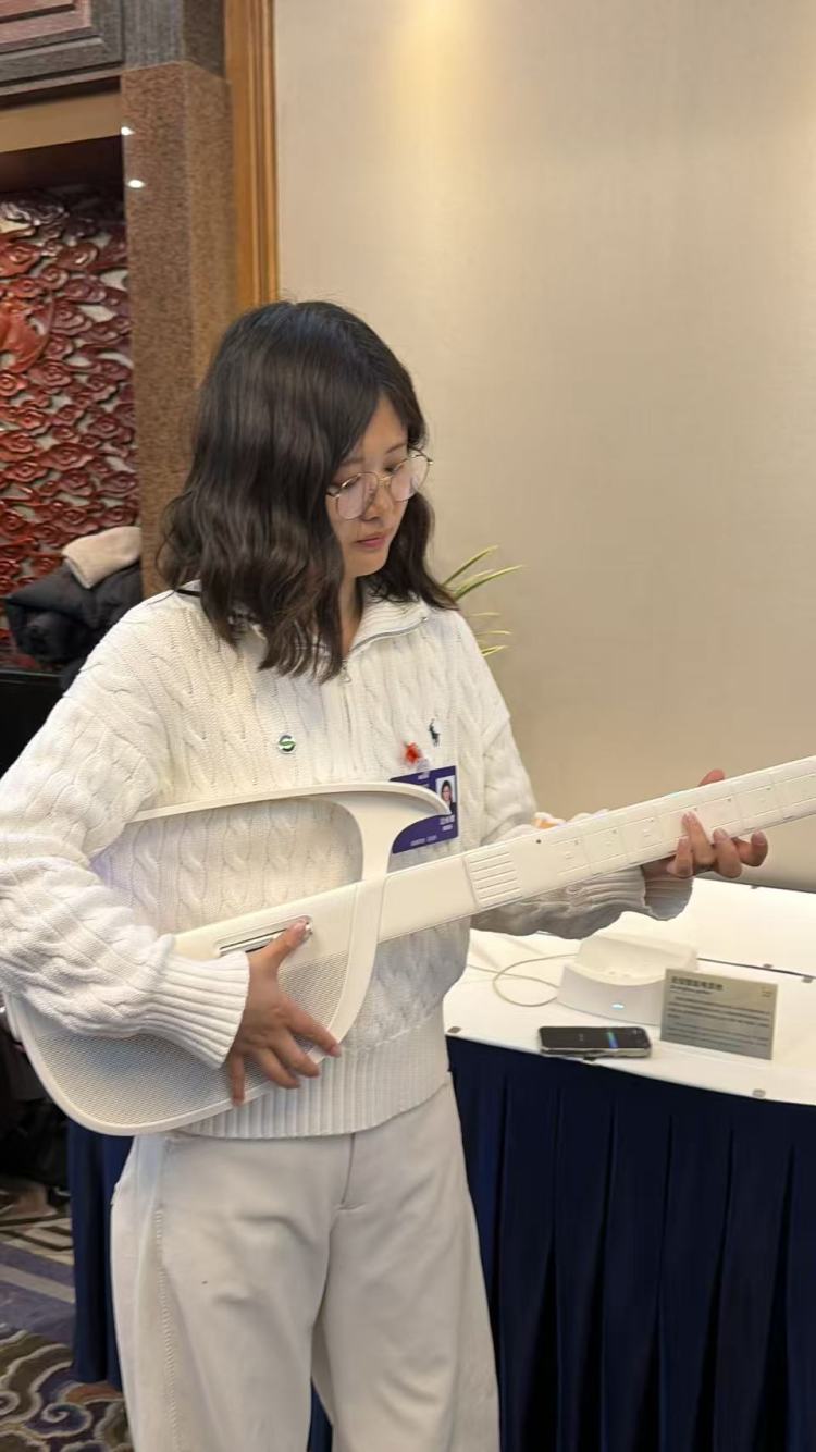 △廣東代表團的工作人員邊詠馨介紹,這把AI吉他,可以讓人3秒鐘學(xué)會彈吉他。 林路攝