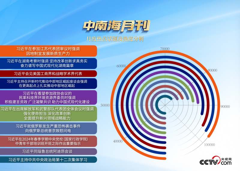 央視網(wǎng)“智聞”系統(tǒng)提取分析2024年3月全網(wǎng)時(shí)政新聞熱點(diǎn)顯示,“習(xí)近平總書記在湖南考察”“新時(shí)代推動(dòng)中部地區(qū)崛起座談會(huì)”等相關(guān)話題備受關(guān)注。