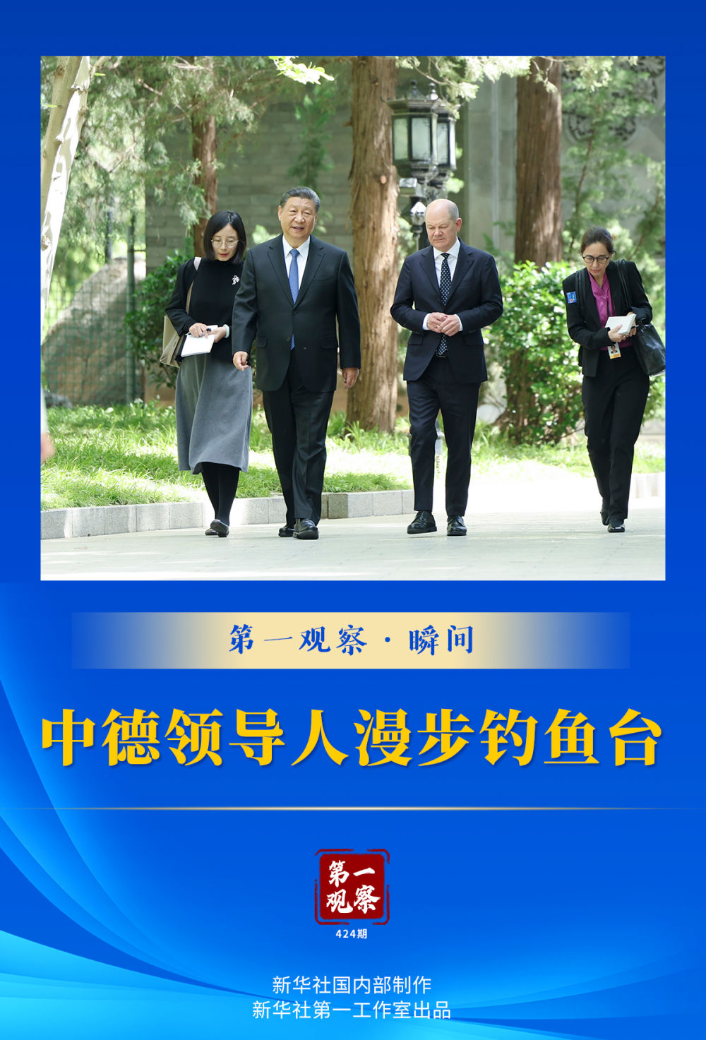 新華社記者的鏡頭,記錄下中德兩國(guó)領(lǐng)導(dǎo)人一起散步交流的畫面——
