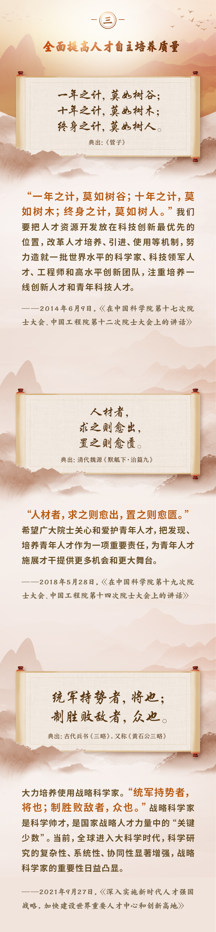 編者按:培養(yǎng)造就大批德才兼?zhèn)涞母咚刭|(zhì)人才,是國家和民族長遠發(fā)展大計。黨的十八大以來,習(xí)近平總書記圍繞人才工作發(fā)表一系列重要論述,立意高遠,內(nèi)涵豐富,思想深刻,深刻回答了為什么建設(shè)人才強國、什么是人才強國、怎樣建設(shè)人才強國的重大理論和實踐問題。在這些重要論述中,總書記精妙運用古代典籍、經(jīng)典名句,以古喻今、啟迪思想、激蕩精神,讓我們一起來學(xué)習(xí)!