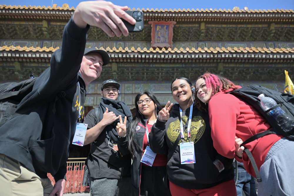 2024年3月19日,美國華盛頓州中學生代表團的成員在故宮乾清宮前合影留念?! ⌒氯A社記者 李鑫 攝