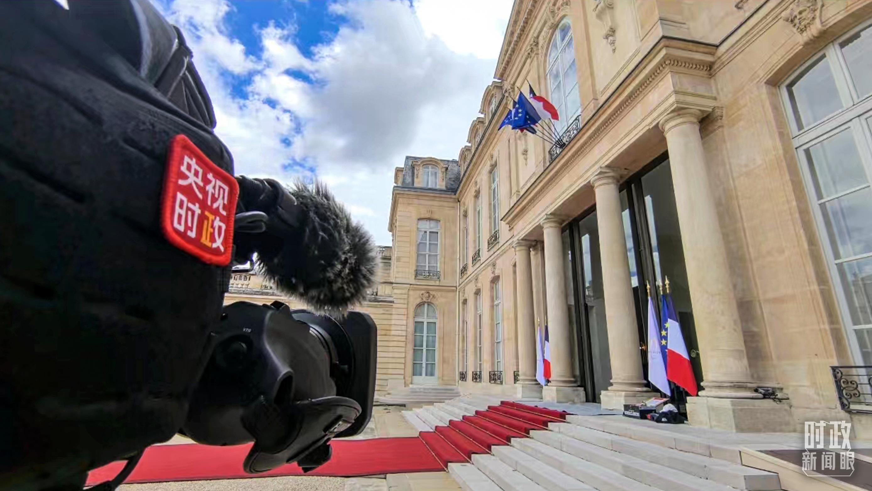中法歐領(lǐng)導(dǎo)人三方會(huì)晤地點(diǎn)——愛麗舍宮懸掛中法兩國(guó)國(guó)旗。(總臺(tái)央視記者劉琦拍攝)