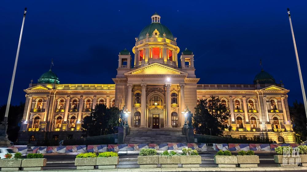 塞爾維亞國(guó)會(huì)大廈亮起紅燈,歡迎習(xí)主席到訪。(總臺(tái)央視記者石丞拍攝)