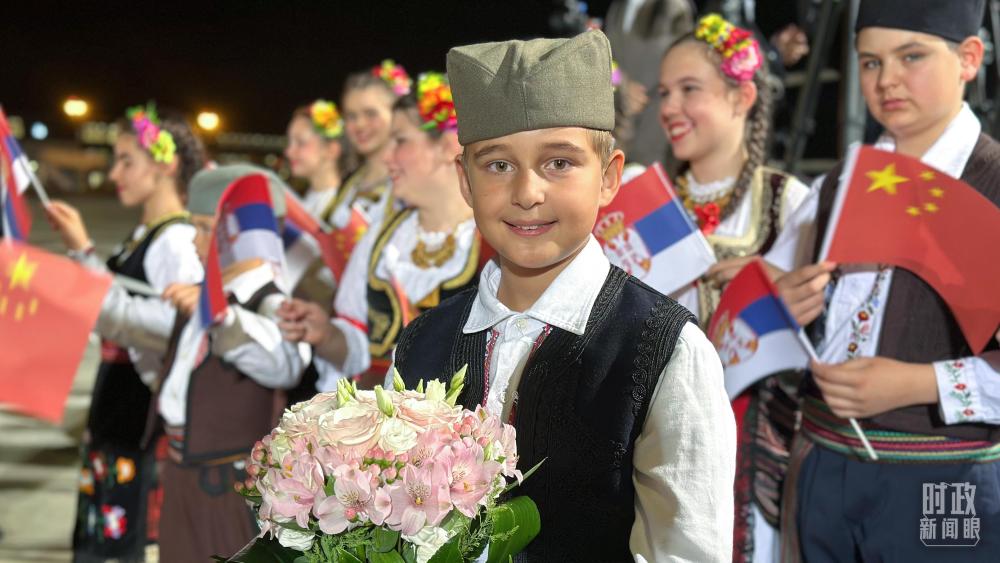 機(jī)場(chǎng)迎接習(xí)主席的塞爾維亞少年。(總臺(tái)央視記者范一鳴拍攝)