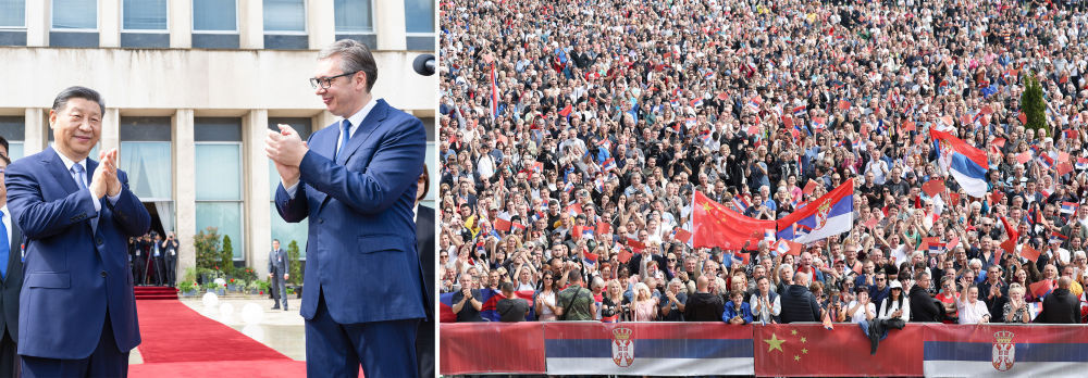 當(dāng)?shù)貢r(shí)間5月8日上午,國(guó)家主席習(xí)近平在貝爾格萊德塞爾維亞大廈同塞爾維亞總統(tǒng)武契奇舉行會(huì)談。會(huì)談前,武契奇陪同習(xí)近平來(lái)到政府大廈平臺(tái)(左圖)。大廈廣場(chǎng)上,一萬(wàn)五千名塞爾維亞民眾揮舞中塞兩國(guó)國(guó)旗,對(duì)習(xí)近平表示最熱烈的歡迎(右圖)。