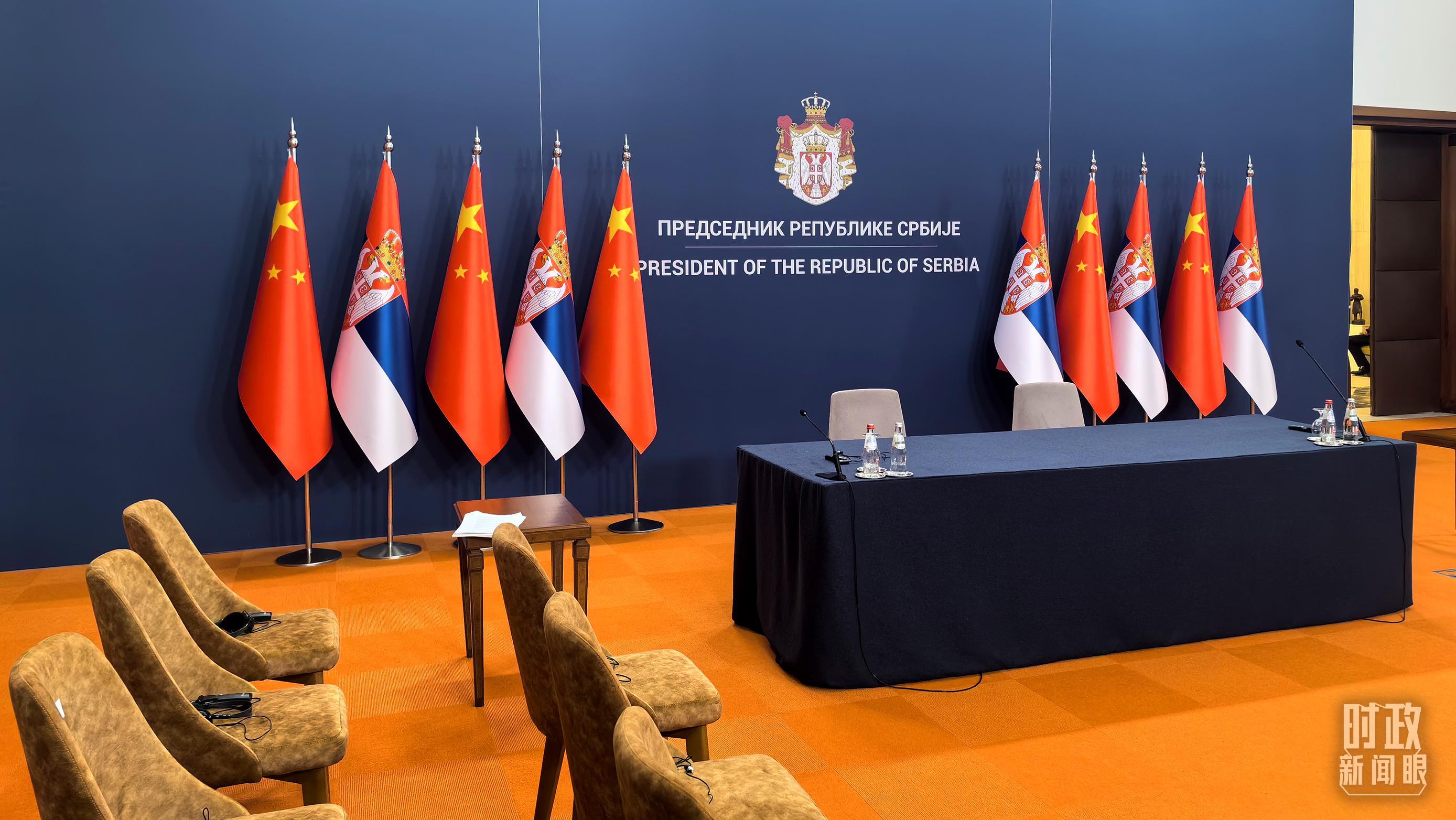 習(xí)主席同武契奇總統(tǒng)會(huì)談后共同會(huì)見記者,這是會(huì)見開始前的現(xiàn)場(chǎng)。(總臺(tái)央視記者鄂介甫拍攝)