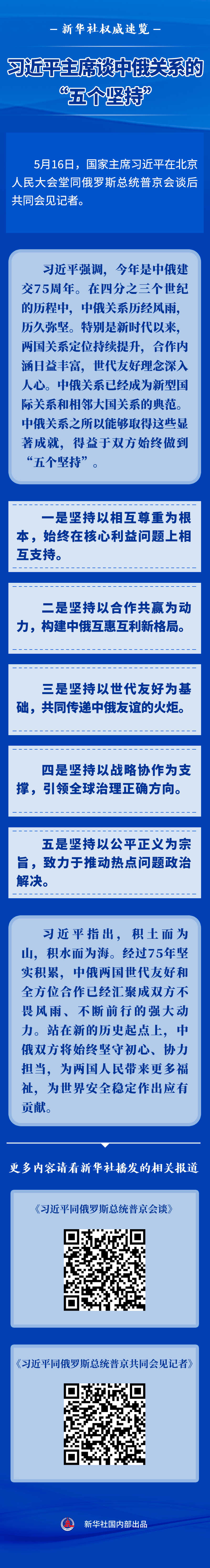 5月16日,國家主席習近平在北京人民大會堂同俄羅斯總統(tǒng)普京會談后共同會見記者。習主席談到中俄關(guān)系的“五個堅持”。