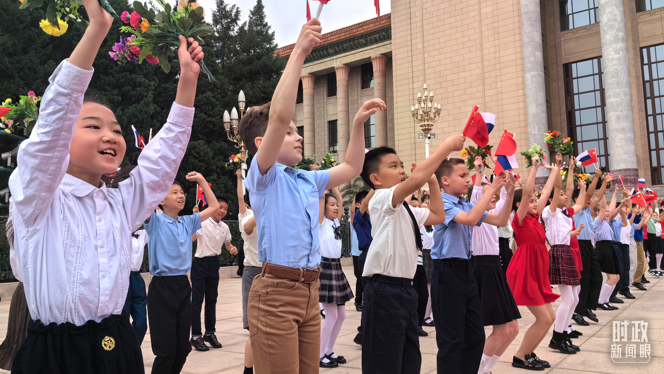 歡迎儀式現(xiàn)場的中俄少年兒童。(總臺央視記者王子杭、段德文拍攝)