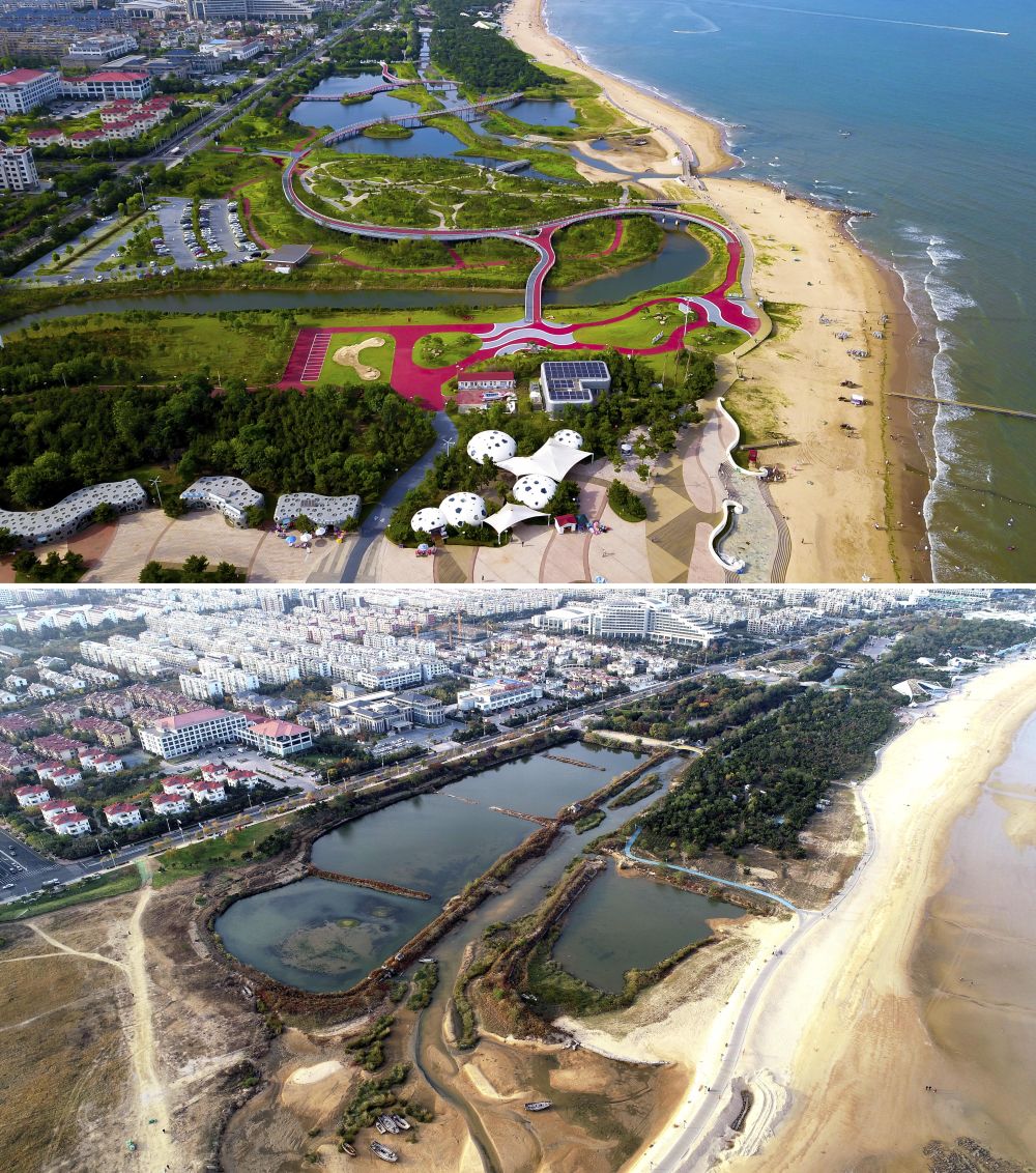 這是一張拼版照片,上圖為2021年拍攝的生態(tài)修復完成后的山東日照市陽光海岸綠道,該綠道長28公里(無人機照片);下圖為2019年11月拍攝的日照市陽光海岸綠道未經(jīng)生態(tài)修復時的樣子。新華社記者 郭緒雷 攝