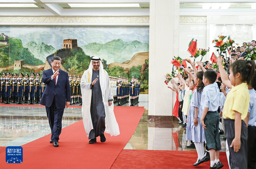 5月30日下午,國(guó)家主席習(xí)近平在北京人民大會(huì)堂同來(lái)華國(guó)事訪問(wèn)并出席中國(guó)-阿拉伯國(guó)家合作論壇第十屆部長(zhǎng)級(jí)會(huì)議開(kāi)幕式的阿聯(lián)酋總統(tǒng)穆罕默德舉行會(huì)談。這是會(huì)談前,習(xí)近平在人民大會(huì)堂北大廳為穆罕默德舉行歡迎儀式。新華社記者 李學(xué)仁 攝